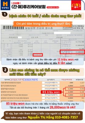 Nhìn ảnh ở trên của bệnh nhân 64 tuổi bị ung thư phổi, Chi phí điều trị lần 1 là 12.000.000 won. bệnh nhân còn phải điều trị 6 lần nữa. Tuy nhiên bệnh nhân đã tham gia gói bảo hiểm 26.000 won 1 tháng của công ty, Nên hầu hết chi phí điều trị đã được công ty chi trả.